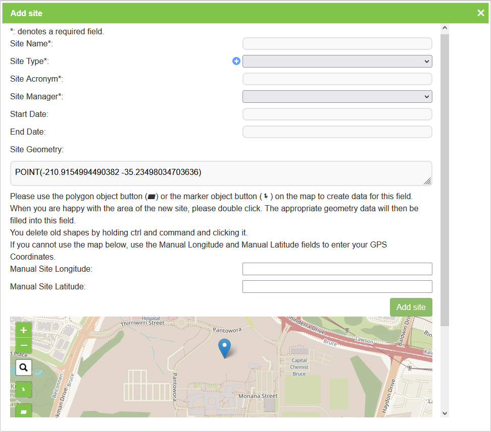 | Site Geometry | Mandatory | This field contains the geographic coordinates of the site. It is populated by the selection of the site on the displayed map. |