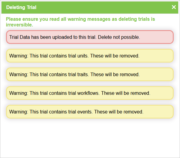 | Delete Trial | Delete this trial. This can only be done if there is no trial data uploaded to this group and this trial is not part of an existing trial group. Users can also choose to clear the trial of trial units and trial traits if they wish. |
