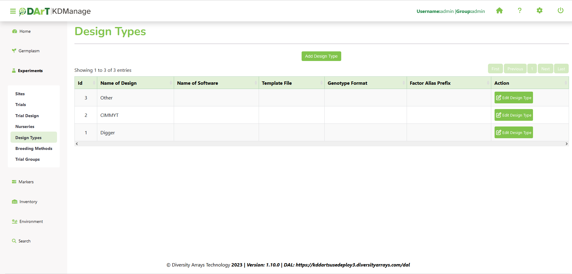 | Genotype Format | Mandatory | Format in which the genotype name and genotype ID will be exported into the trial design input file. The DesignGenotypeFormat must be GenotypeName | GenotypeId (eg VENTURA|41 ) to satisfy DiGGer requirements. |