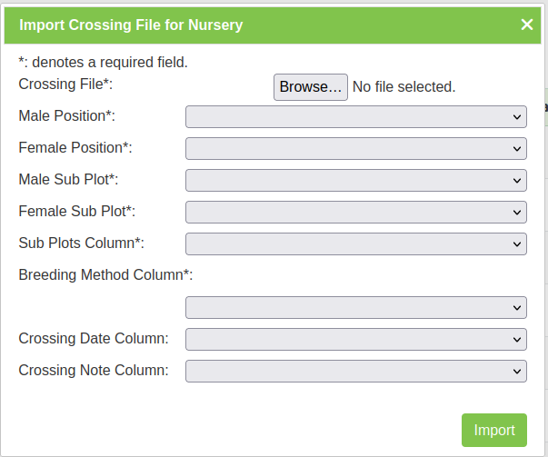 Crossings can be imported (with a CSV file) into nurseries, which can later be harvested to create new genotype and specimen entries.