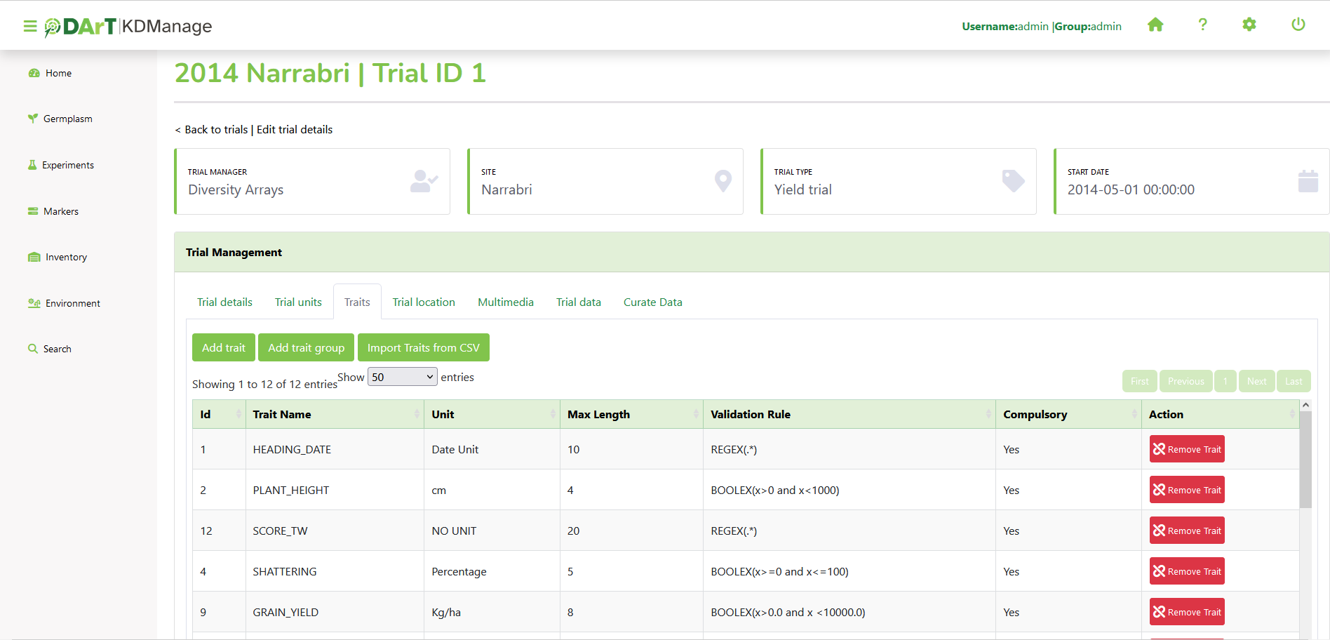 Trial traits can be added individually or in the Trait Groups page.