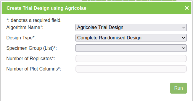 | Replicates | Mandatory | Number of replicates for crossings. |