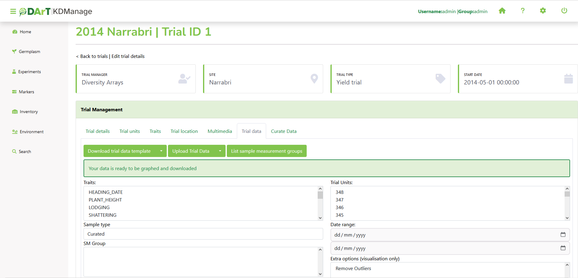 - Download Trial Data - produces a CSV file for importing into KDSmart which contains a trial’s trait results.