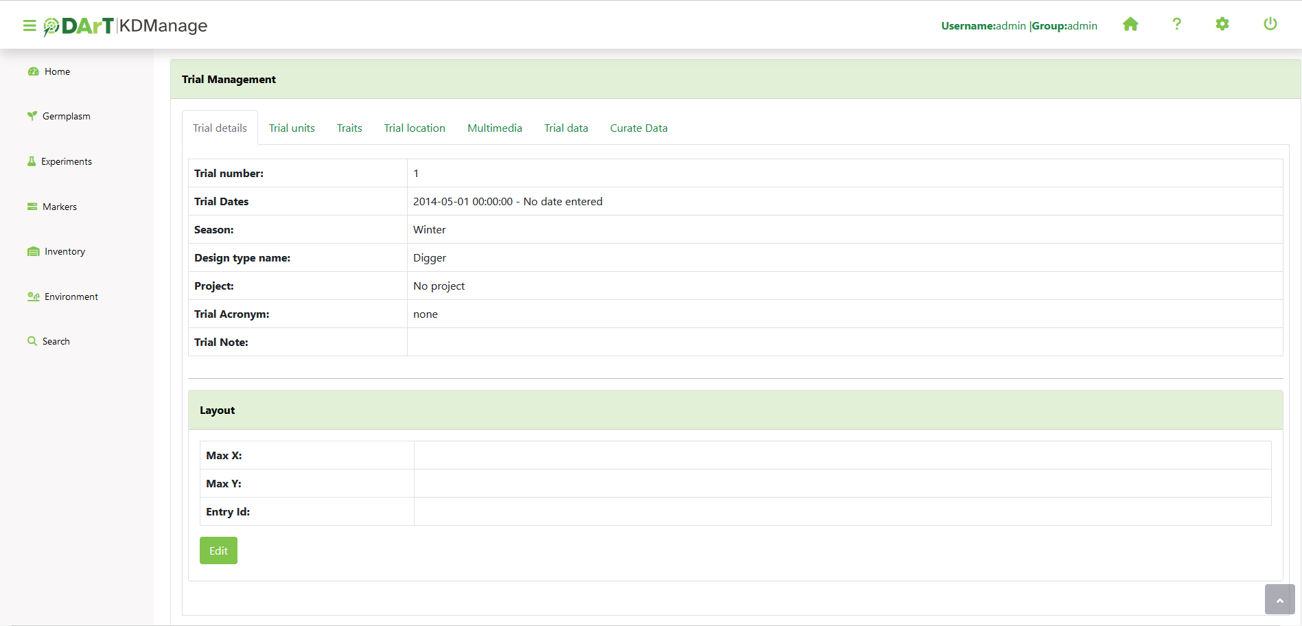 When a trial is selected from the Trials Page, it will be displayed in a Trial View Page (see the image below). The Trial View Page provides all details and data of the selected trial including trial units, trial location, traits, etc. There are also tools available such as data curation.