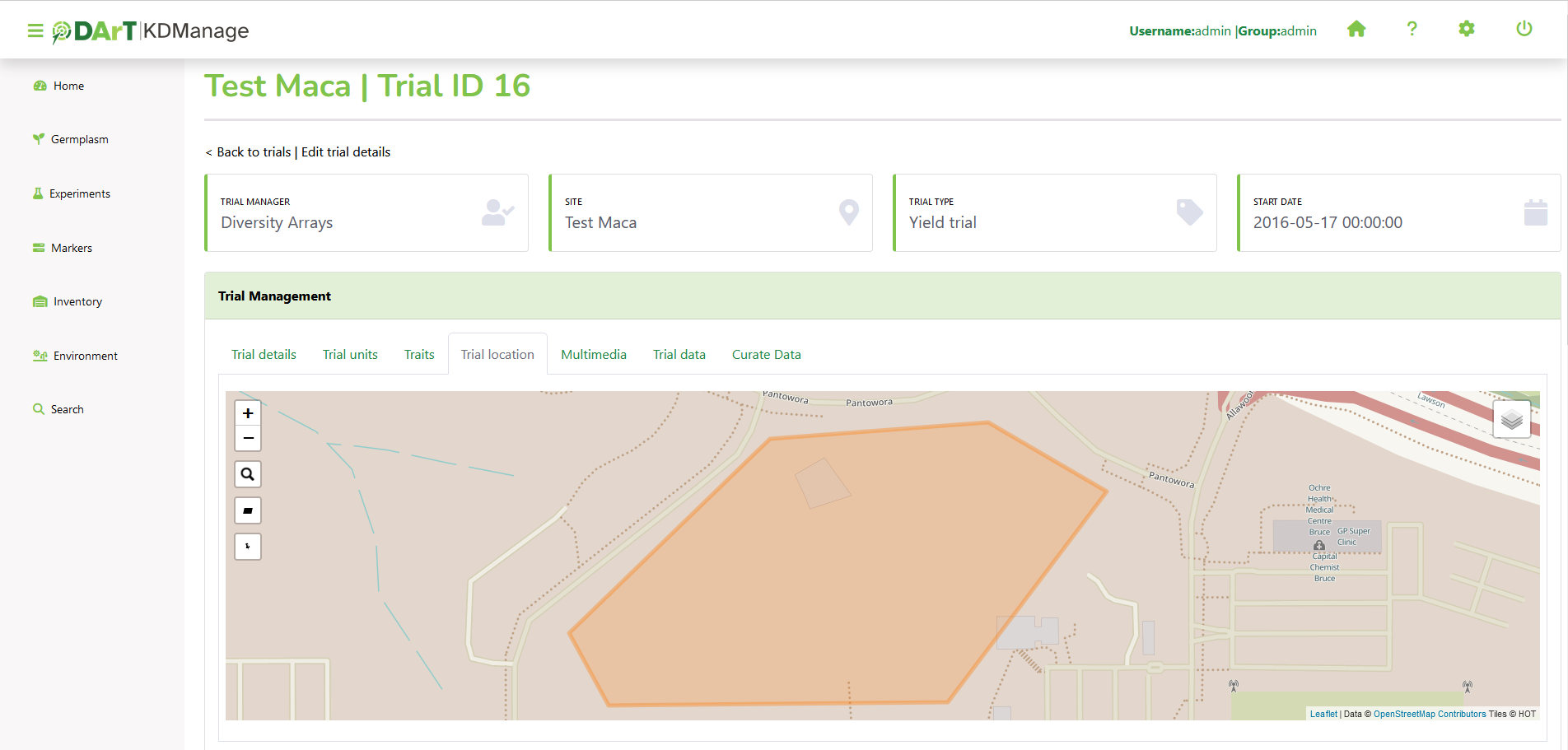 The trial location can be updated and viewed on the Trial Location Tab (see the Adding a Trial Location page).