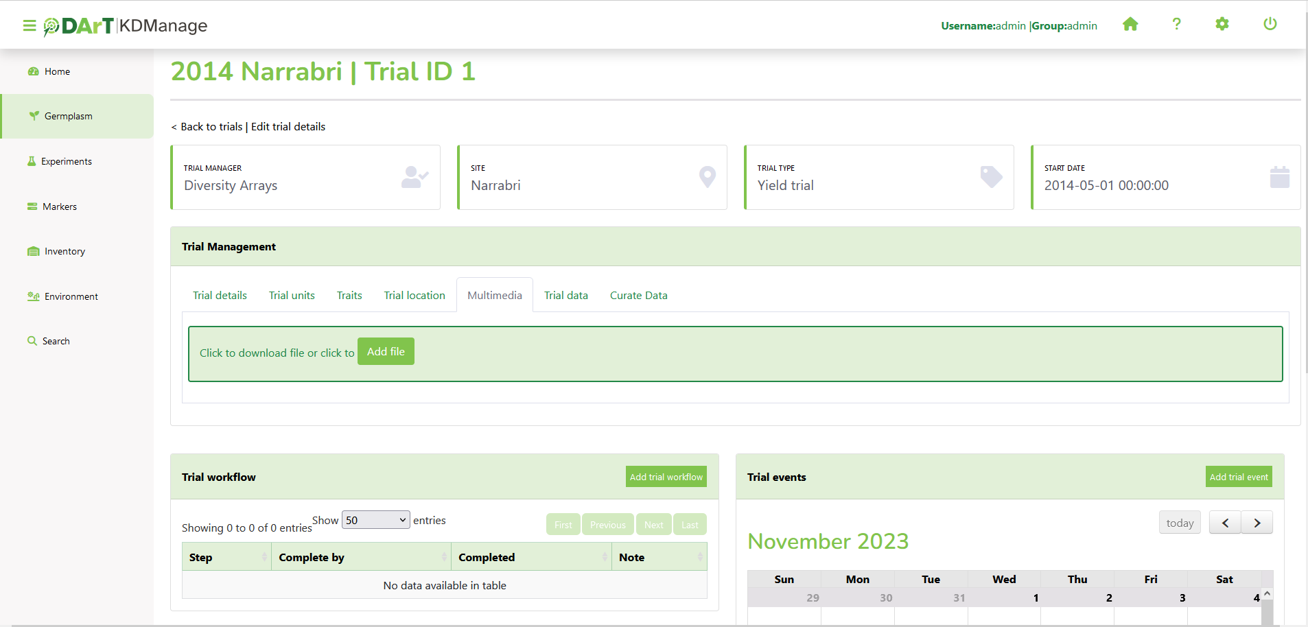 Trials are the equivalent to field or nursery experiments that are performed within a Site.