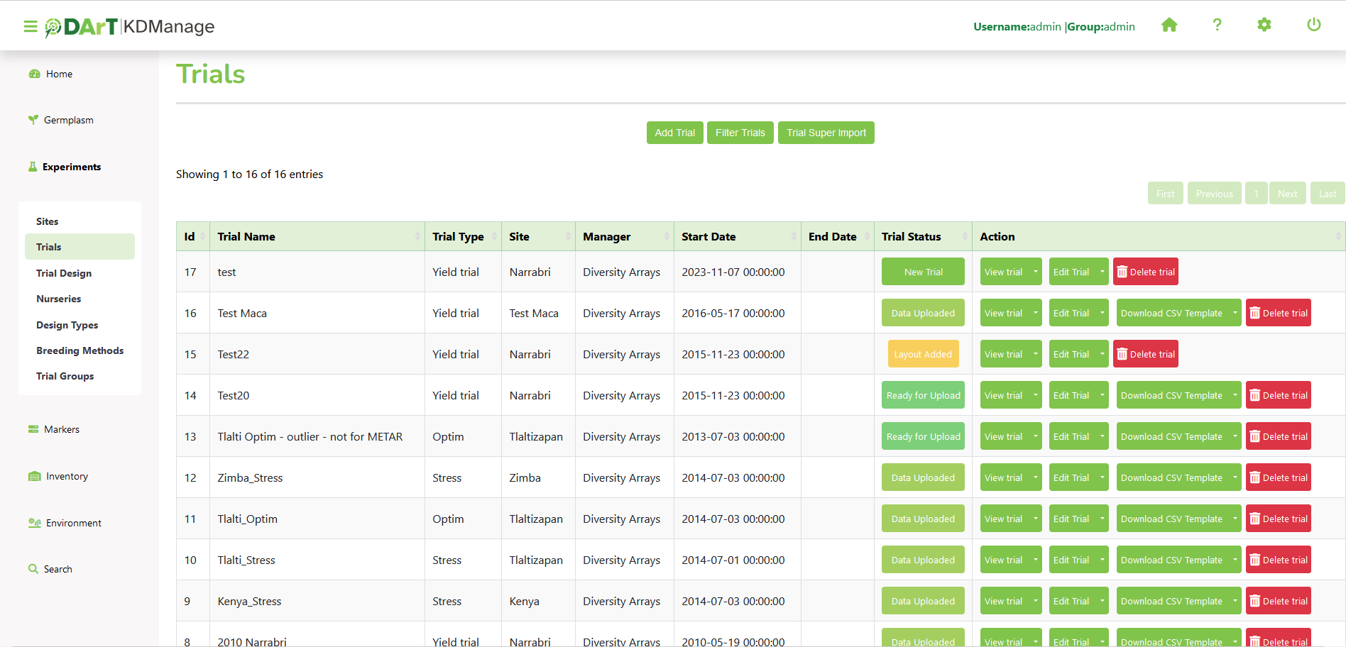 In the image above, the Trials Page shows several trial records. Each record contains a trial’s ID in KDDart as well as its name and available actions.