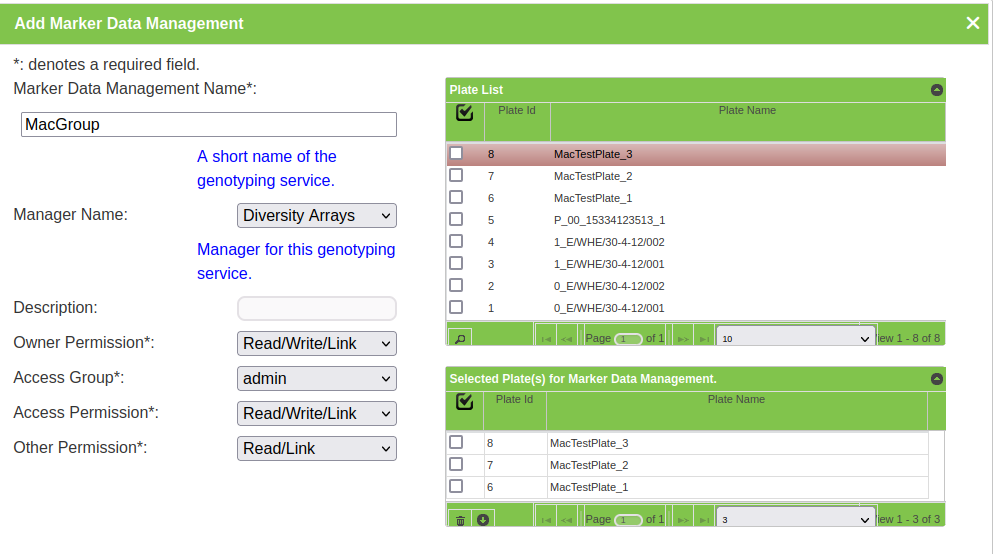 | Marker Data Management Name | Mandatory | Text string to describe the genotyping service. |