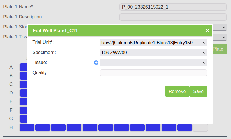 Hovering the mouse above a well will display the trial unit position and the specimen name.