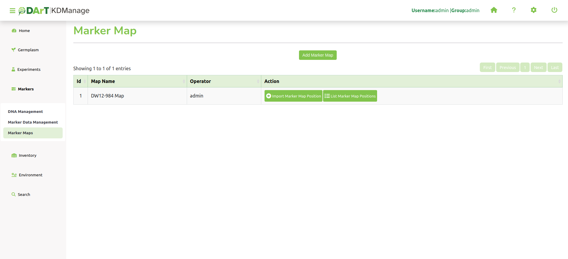 The Marker Maps Page lists marker maps that have been created within KDDart.
