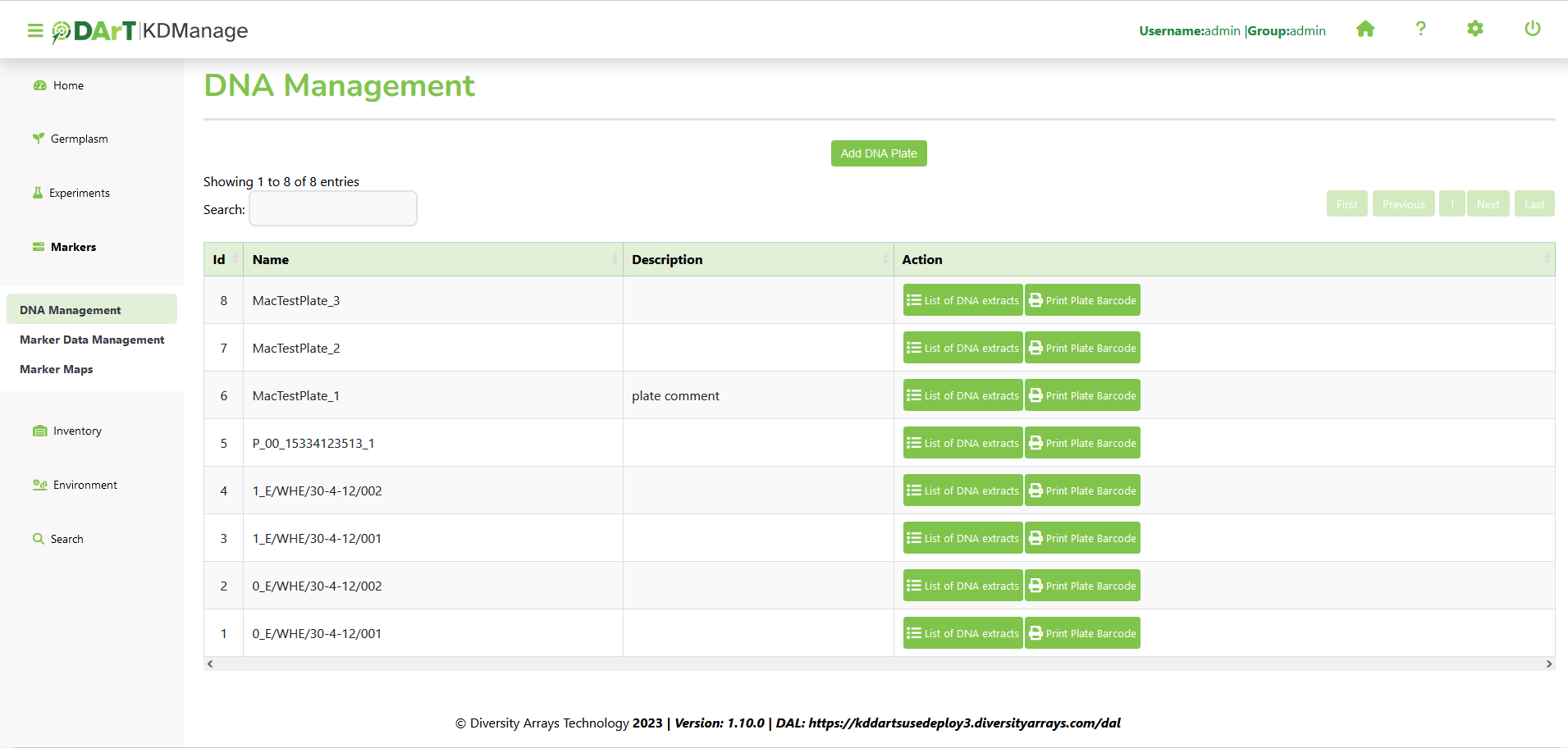 The DNA Management Page lists DNA plates that have been uploaded to KDDart.