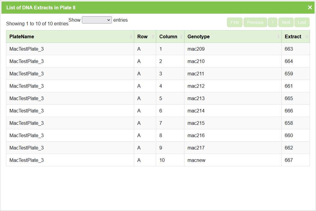 Selecting the List of DNA Extracts button for any plate will display a Plate Window which lists extracts that are associated with that plate (pictured below).
