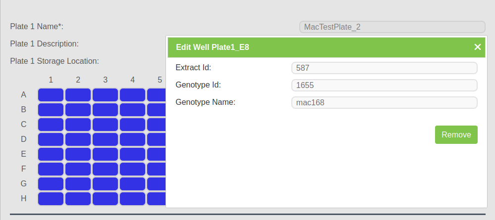 Selecting a well will display the Edit Well Plate Window (as displayed in the following image) where the well may be edited or removed using the buttons on the window.